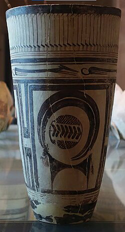 این جام سفالی بزرگ با نقوش گوزن (گوزن کوهی) متعلق به دورهٔ شوش است (حدود ۴۲۰۰–۳۵۰۰ پیش از میلاد)؛ در یکی از آرامگاه های شوش پیدا شده است. اکنون در لوور قرار دارد. این اثر ترکیبی از زیبایی تزئینی و فن سفالگری اولیه است که نشاندهنده هنر پیشرفتهی سرزمینهای بینالنهرین و ایران باستان است. - Bronzes of Luristan